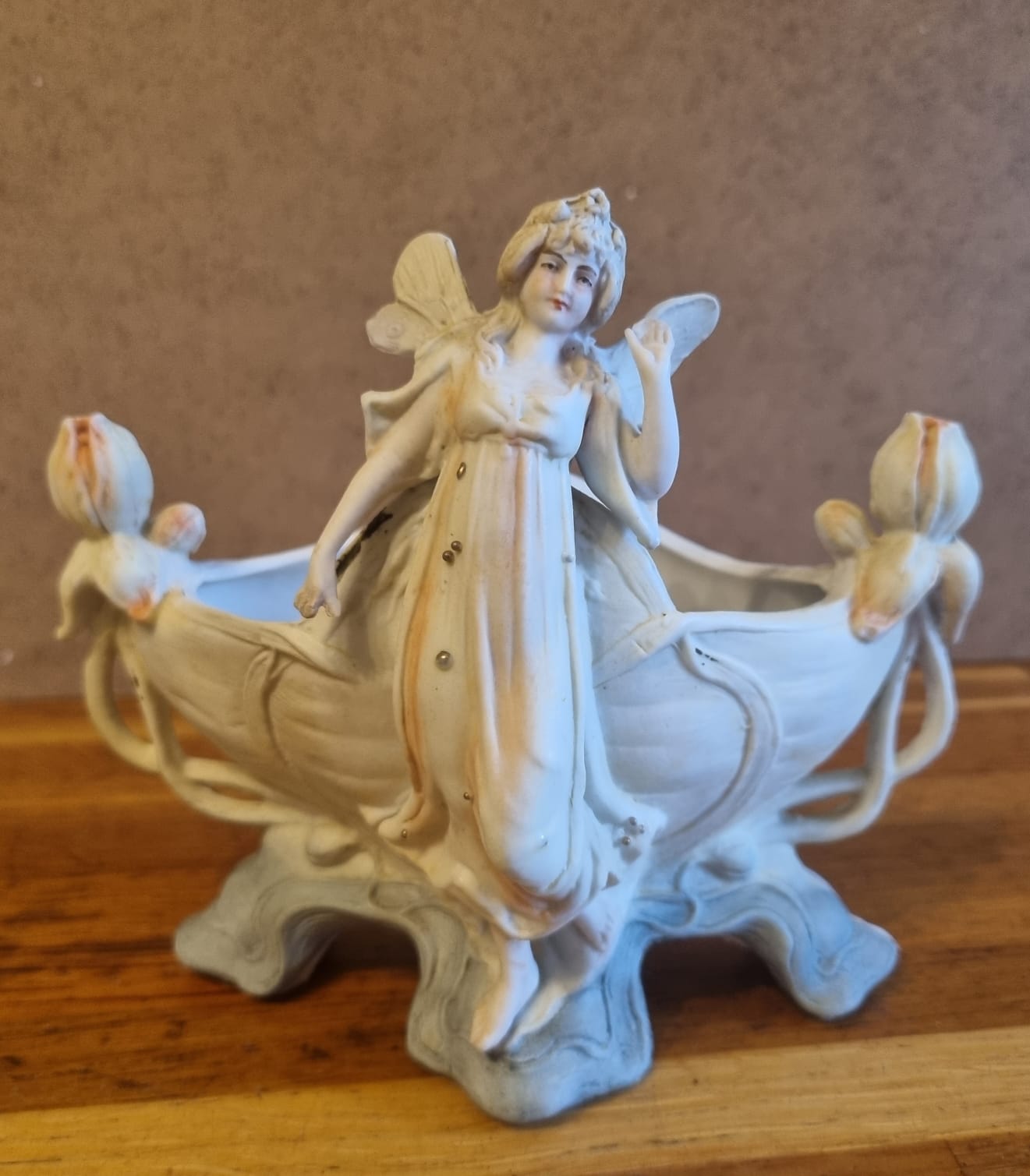 Beutiful and rare German made bisque Art Nouveau vase-bowl, with a figure of a fariry/nymph. HAND PAINTED – Possibly attribution to Shafer Vater In great condition with no damage. Measurements approx: Height 13cm, Width 14.5cm, Depth 9cm.