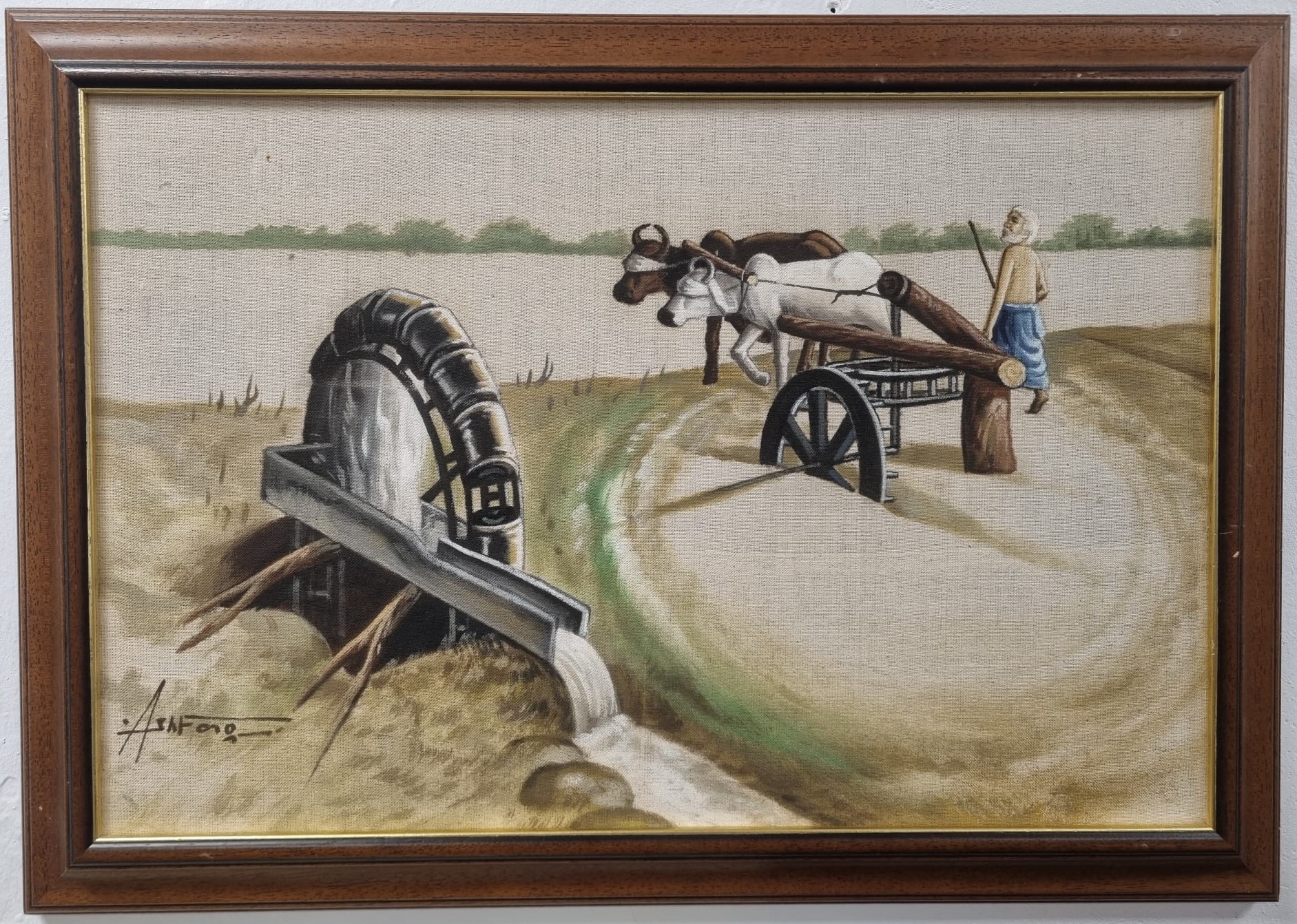 ASHTONG. Farm Scene. Size: 59cm x 41cm (framed). £20. An unusual painting. This one has a naïve charm.