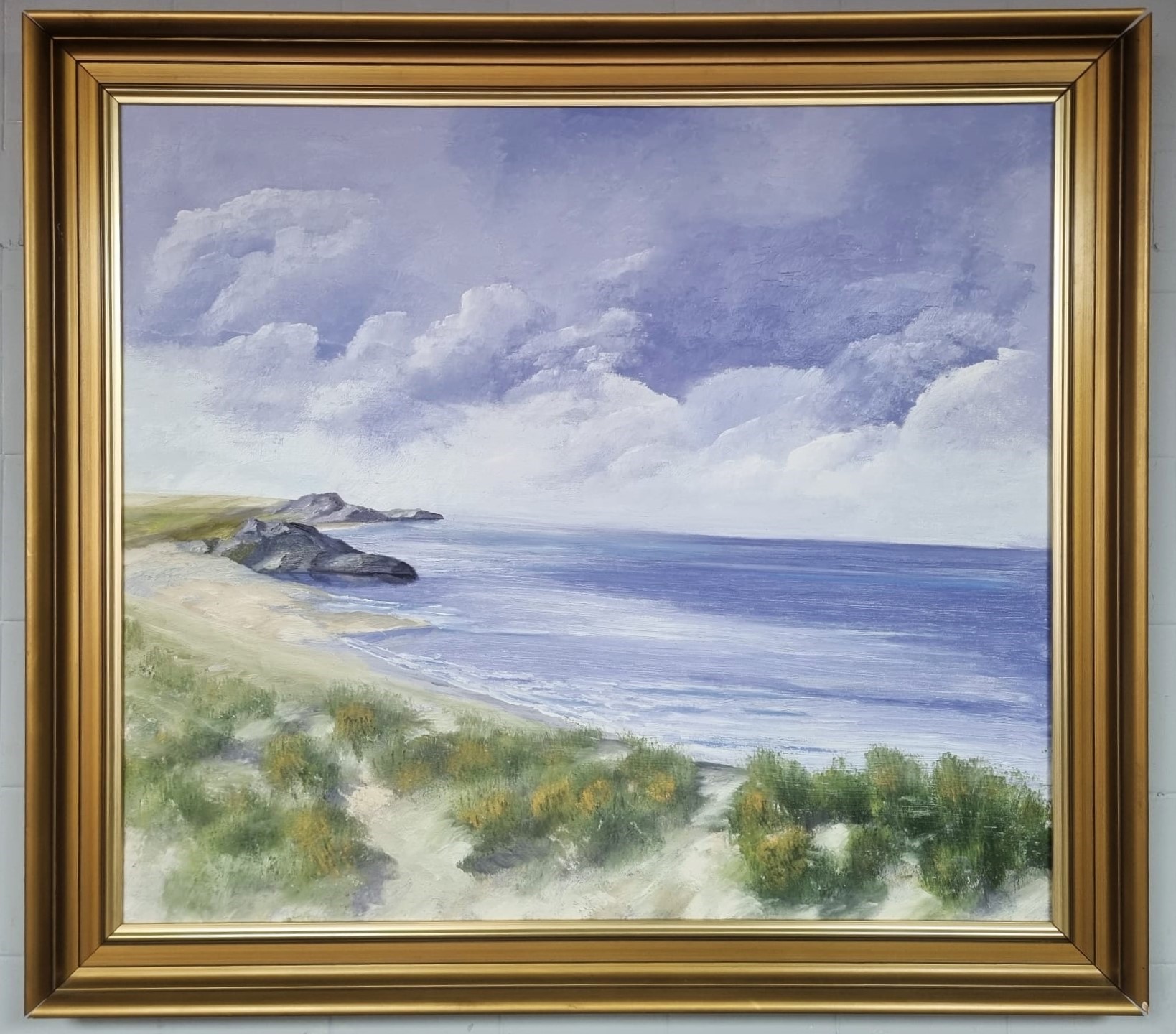 Size: 97cm x 87cm (including Frame) ORIGINAL – OIL ON CANVAS Seascape UNSIGNED £50 A beautiful beach scene, large oil on canvas painting, this artwork is unsigned.