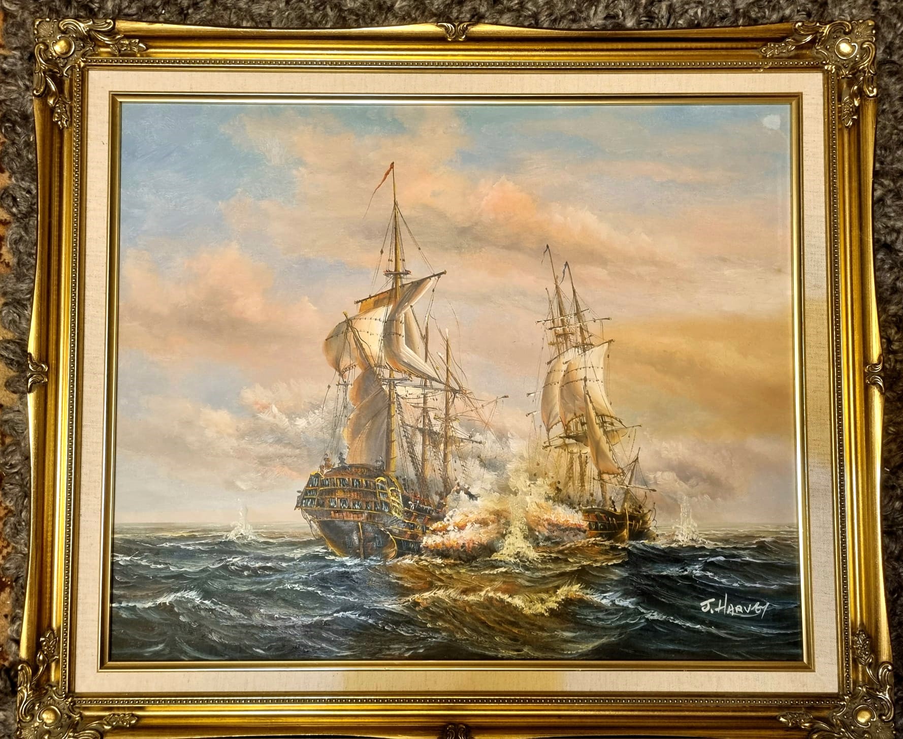 Size: (visible artwork) ORIGINAL – OIL ON BOARD (framed)Tall Ship Battle Scene. J HARVEY. £120
