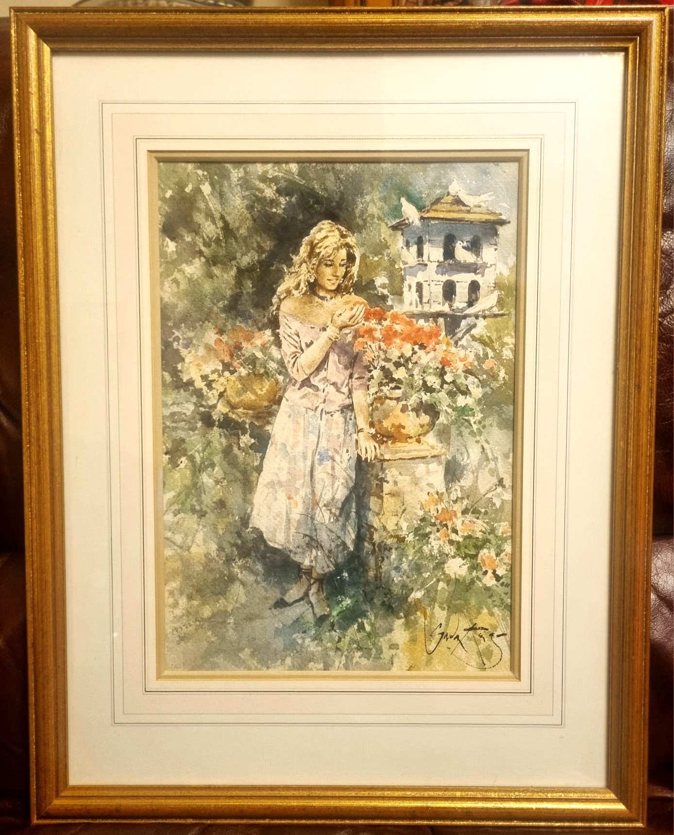 Size: 26cm x 37cm (visible artwork) Size: 44.5cm x 56cm (frame) ORIGINAL – WATERCOLOUR Lady by the Dove House. GEORGE KING. £650 This is a highly collectable original watercolour by George King. His works of this scale sell in the £1,000’s.